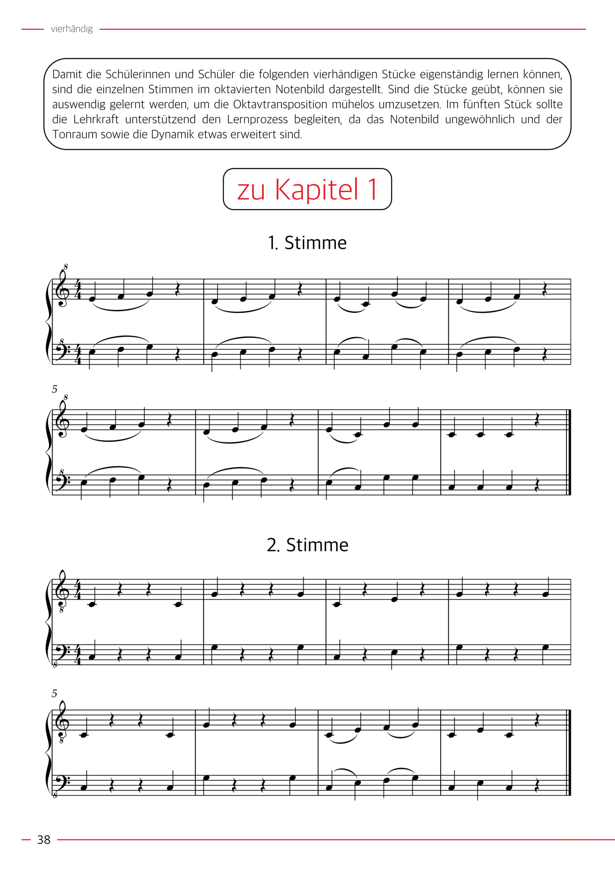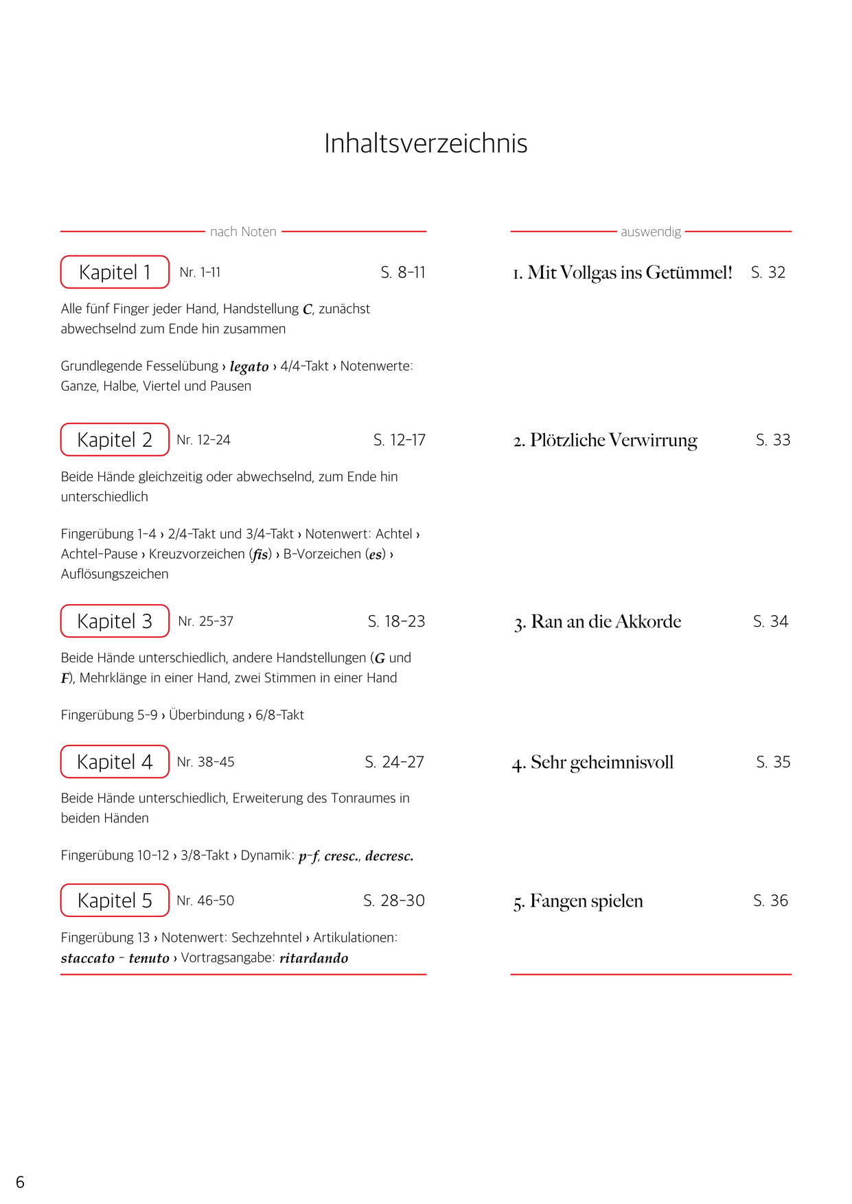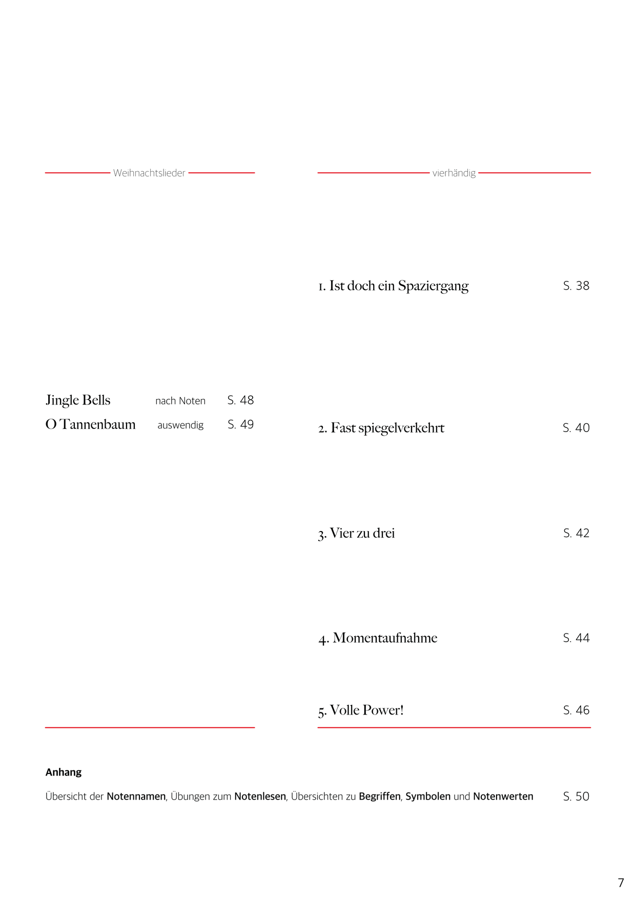 • Inhalt: 50 Stücke in 5 Kapiteln nach Noten, 5 Konzertstücke zum auswendig Lernen, 2 Weihnachtslieder zum Mitsingen und 5 vierhändige Konzertstücke zum eigenständigen erarbeiten, die an die Lernstufen der 5 Kapitel nach Noten angepasst sind